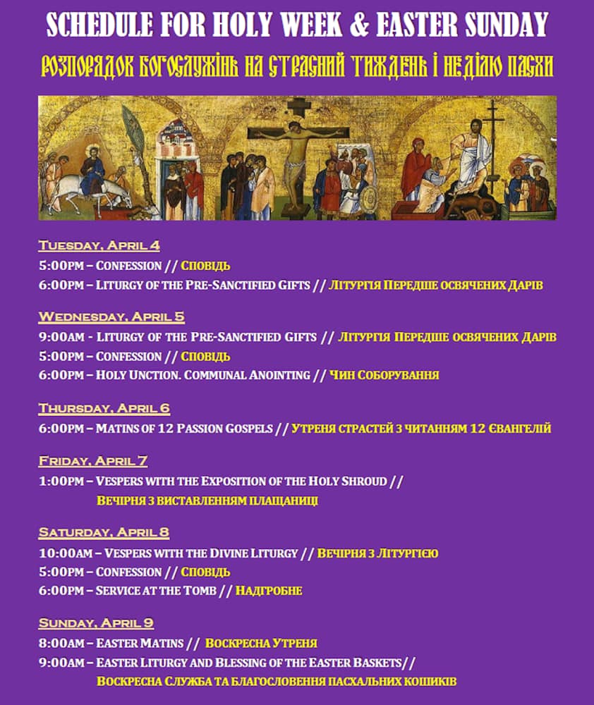 Schedules Schedule for ordinary time SUNDAYDIVINE LITURGY (Eng/Ukr)10:00 am IN PERSON & LIVE STREAMMONDAYNO SERVICESTUESDAY – FRIDAYDIVINE LITURGY (Eng)SATURDAY DIVINE LITURGY (Eng) SATURDAYGREAT VESPER (Eng)5:00 PM IN PERSON & LIVE STREAM Share this: Click to share on X (Opens in new window) X Click to share on Facebook (Opens in new window) Facebook Like Loading...
